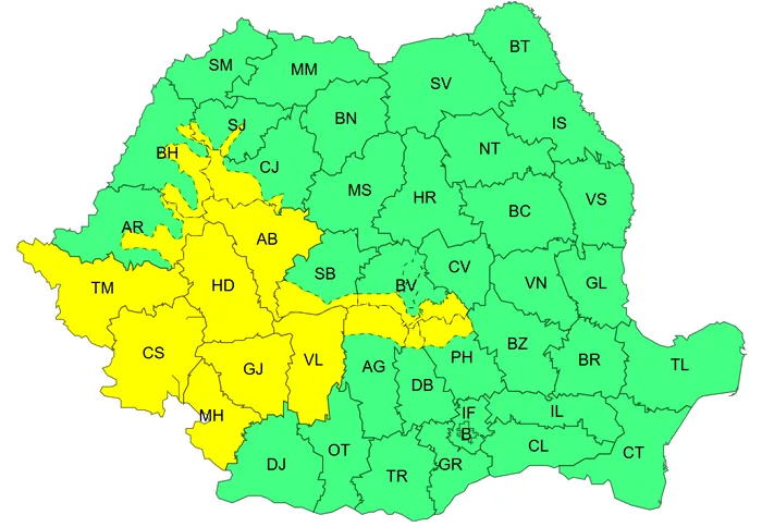 O altă atenționare cod galben de vânt și precipitații însemnate cantitativ pentru Banat, sud-vestul Transilvaniei, vestul și nordul Olteniei și în Carpații Meridionali și Occidentali este valabilă până luni, 5 ianuarie, ora 20:00.