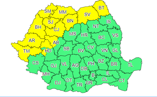 În intervalul 27 iunie, ora 14 – 28 iunie, ora 03, în nordul Banatului, Crișana, Maramureș, vestul și nordul Transilvaniei, precum și în nordul Moldovei, local vor fi perioade cu instabilitate atmosferică accentuată. Aceasta se va manifesta prin averse, descărcări electrice, intensificări de scurtă durată ale vântului (cu rafale de 55…70 km/h), pe arii restrânse vijelii și grindină. În intervale scurte de timp sau prin acumulare cantitățile de apă vor fi de 20…25 l/mp și izolat de peste 30…40 l/mp.