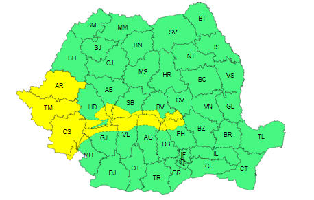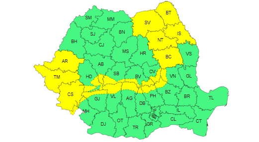 De asemenea, meteorologii au emis un al doilea cod galben valabil pentru mai multe județe din sud-vestul țării.  În perioada 27 martie, ora 22 – 28 martie, ora 10, vântul va avea intensificări în Banat, sudul Crișanei și în Carpații Meridionali. Vor fi viteze în general de 55…65 km/h, iar la altitudini mari în zonele montane, rafalele vor depăși 90 km/h.