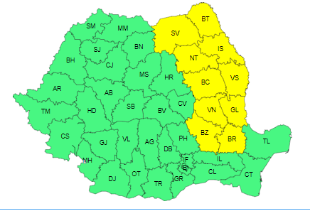 De asemenea, meteorologii au mai emis un cod galben de vânt, valabil în intervalul 14 februarie, ora 08 – 14 februarie, ora 20. În intervalul menționat, vântul va prezenta intensificări temporare în Moldova și nord-estul Munteniei, cu viteze la rafală de 55…65 km/h.