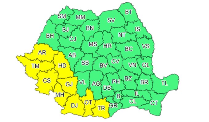 În intervalul 01 iulie, ora 18 – 02 iulie, ora 06, în Banat, sudul Crișanei și Oltenia, local vor fi perioade cu instabilitate atmosferică accentuată. Aceasta se va manifesta prin averse și cu caracter torențial, descărcări electrice, intensificări de scurtă durată ale vântului (cu rafale de 55…70 km/h), pe arii restrânse vijelii și grindină. În intervale scurte de timp cantitățile de apă vor fi de 20…25 l/mp și izolat de peste 40 l/mp.
