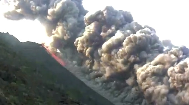 Institutul Italian de Geofizică şi Vulcanologie a postat un video în care se poate vedea o coloană imensă de fum în timp ce lava curge pe lateralul vulcanului.