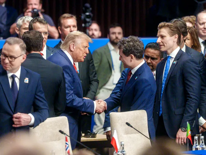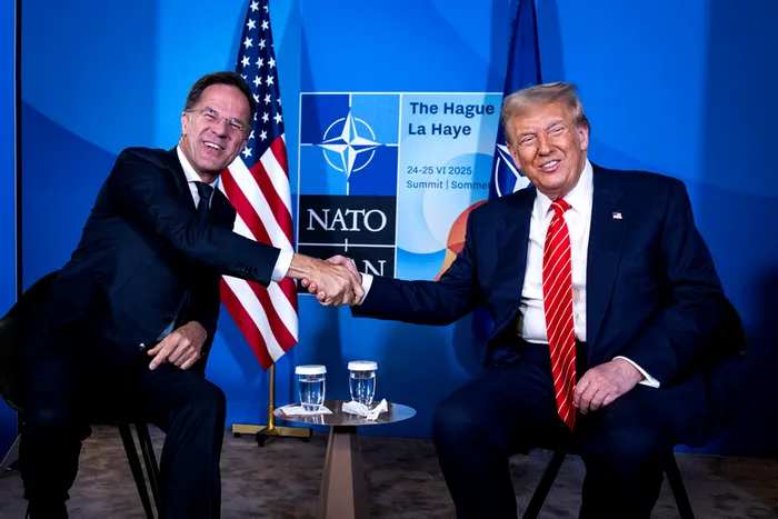 HANDOUT – 25 June 2025, Netherlands, The Hague: NATO Secretary General Mark Rutte and US President Donald Trump shake hands after giving remarks to the press on the sidelines of the 2025 NATO Summit. Photo: Martijn Beekman/NATO/dpa – ATTENTION: editorial use only and only if the credit mentioned above is referenced in full