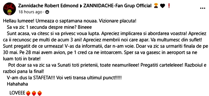 Sunt pregătit de ce urmează! V-aș da informații, dar n-am voie. Doar vă zic să urmăriți finala de pe 30 mai. Pe 28 avem avion, pe 1 cred că ne întoarcem. Sper să vă găsesc în aeroport să ne luăm toți în brațe!