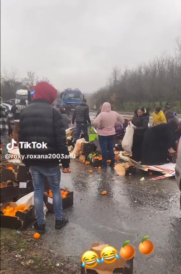 Zeci de oameni s-au înghesuit să adune portocalele, căzute dintr-un TIR care transporta tone de fructe, pe o șosea din Mehedinți. Imaginile, devenite virale pe social-media, arată cum localnicii se străduiesc să culeagă cât mai multe portocale de pe carosabil.