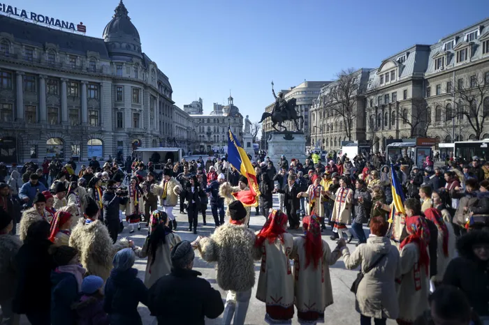 Tineri imbracati in port popular danseaza in timpul evenimentului „Hora Unirii la Bucuresti”, organizat de Creart si Primaria Municipiului Bucuresti, pentru a marca implinirea a 159 de la Unirea Principatelor Romane, in Piata Universitatii din Bucuresti, miercuri, 24 ianuarie 2018. ANDREEA ALEXANDRU / MEDIAFAX FOTO