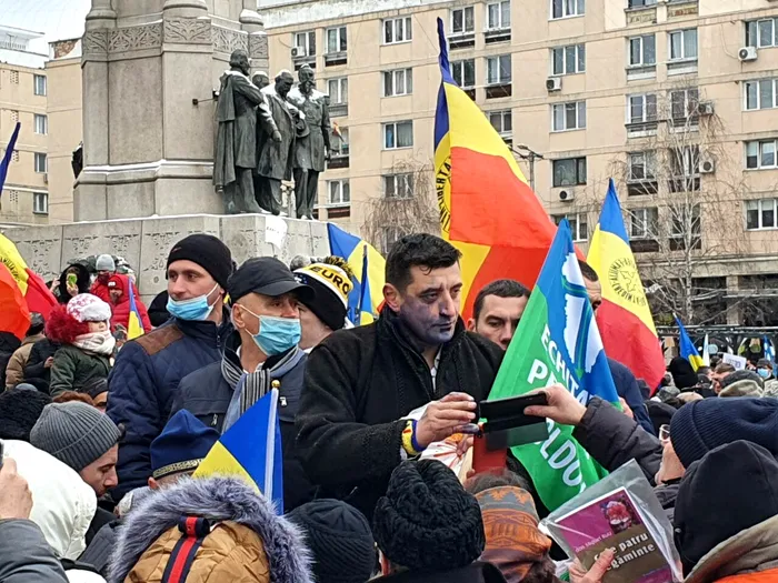 Liderul Aliantei pentru Unirea Romanilor, George Simion, a fost stropit cu cerneala in timpul unui miting organizat pentru sarbatorirea Unirii Principatelor Romane, in ciuda deciziei autoritatilor locale de a interzice adunarile publice, ca urmare cresterii numarului de infectari cu SARS-COV-2, COVID-19, luni, 24 ianuarie 2022, la Iasi. ZIARUL DE IASI /MEDIAFAX FOTO
