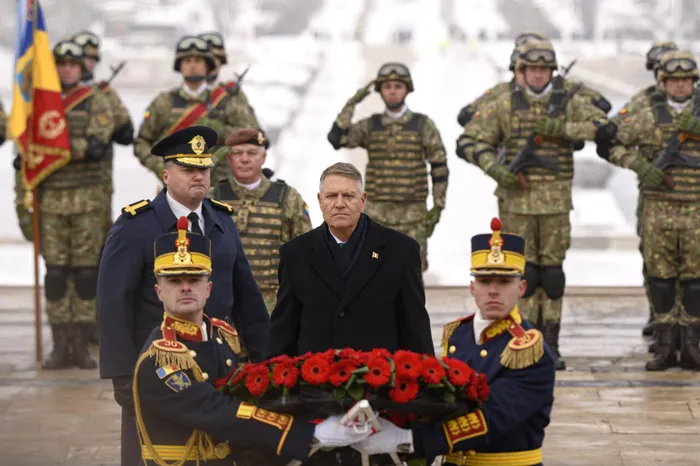 Presedintele Klaus Iohannis depune o coroana de flori in timpul unei ceremonii organizate cu prilejul Zilei Unirii Principatelor Romane, la monumentul Mormantul Ostasului Necunoscut din parcul Carol I, in Bucuresti, miercuri, 24 ianuarie 2024. ALEXANDRU DOBRE/ MEDIAFAX FOTO.