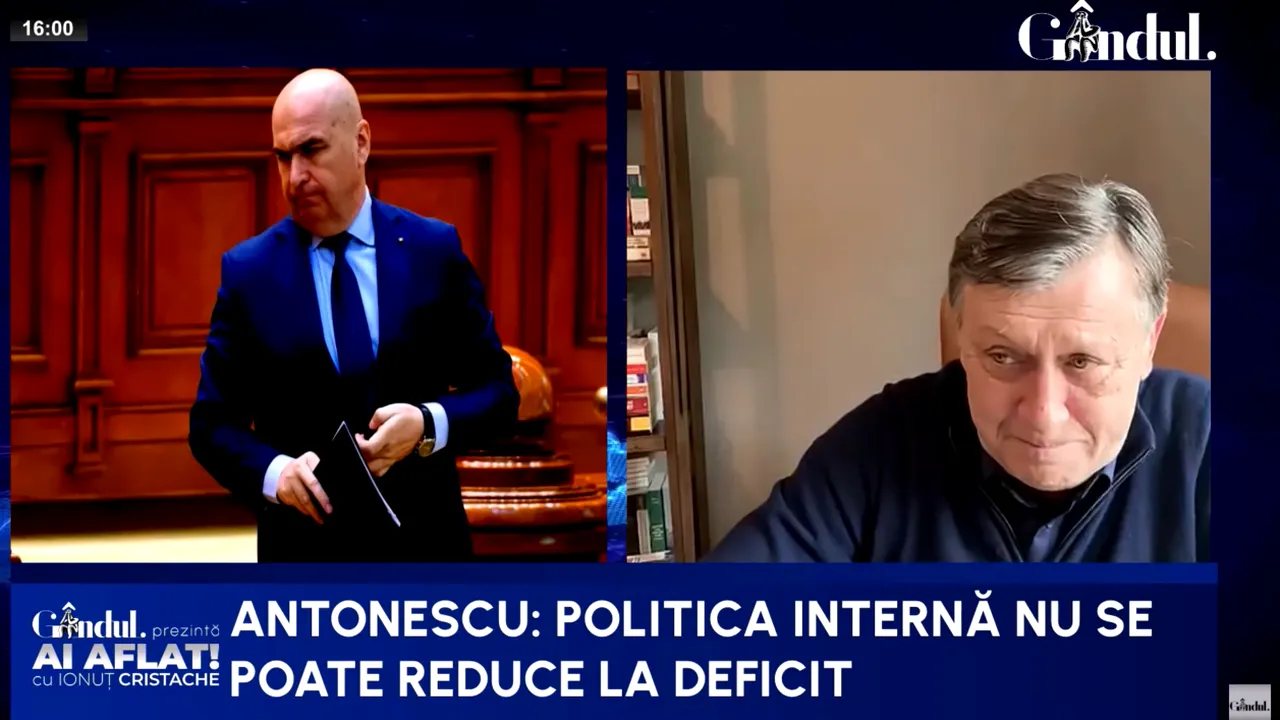 În cadrul emisiunii Ai aflat! cu Ionuț Cristache, Crin Antonescu a lansat un nou val de critici la adresa lui Ilie Bolojan, pe care îl acuză că reduce mandatul de prim-ministru doar la problema deficitului bugetar. Urmăriți aici emisiunea integrală.