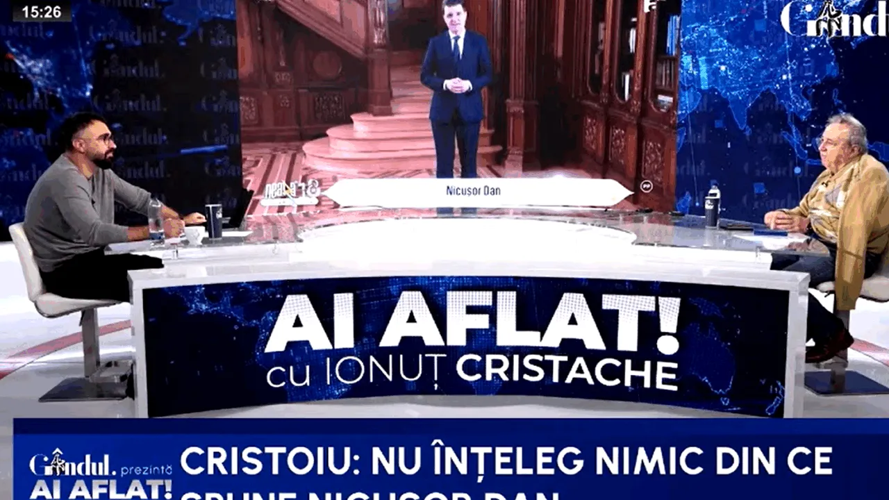 Ediția de luni a emisiuniiAi Aflat!, transmisă live din studioul Gândului, a prilejuit un dialog între jurnaliștii Ionuț Cristache și Ion Cristoiu pe tema apariției intempestive a lui Nicușor Dan în timpul emisiunii ”Neatza cu Răzvan și Dani”. În opinia cunoscutului analist politic, șeful statului a compromis prerogativele funcției, fiind vorba de o emisiune mondenă.