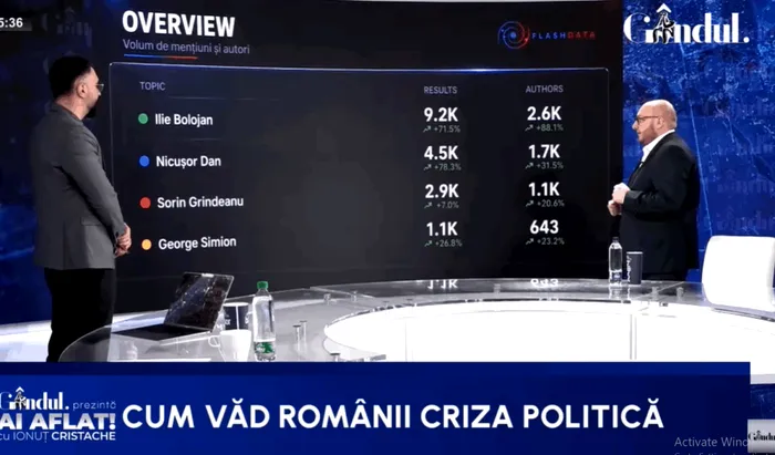 Mediul online vizat de analiză a implicat tot ce înseamnă social media, Facebook, Twitter, X, TikTok și presa online. Metodologia a analizat ocurențele, mențiunile, începând cu 19 până pe 22 aprilie, după discursul lui Nicușor Dan, mențiuni despre principalii 4 actanți ai crizei politice în tot mediul online. Este vorba de premierul Bolojan, președintele Dan, președintele PSD Sorin Grindeanu și președintele principalului partid de opoziție, AUR, George Simion.