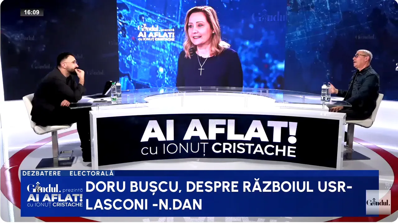 În cadrul unei ediții transmise live de Gândul a emisiunii „Ai Aflat! cu Ionuț Cristache”, Doru Bușcu, ziarist, a discutat despre Elena Lasconi și despre calitatea ei de membru USR. Ziaristul și-a declarat susținerea pentru Lasconi când aceasta se afla în turul II. Urmăriți aici, integral, emisiunea lui Ionuț Cristache.