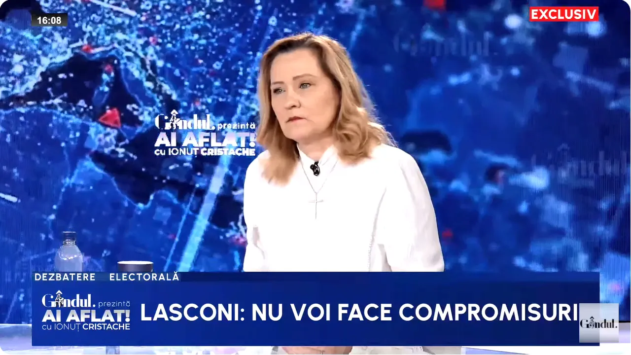 În emisiunea lui Ionuț Cristache, Lasconi a vorbit despre România ca despre o femeie frumoasă. O femeie frumoasă care e plină de frustrări adunate în 35 de ani de la Revoluție. După spusele acesteia, României i s-au furat hainele și bijuteriile, dar nu i s-a luat sufletul.