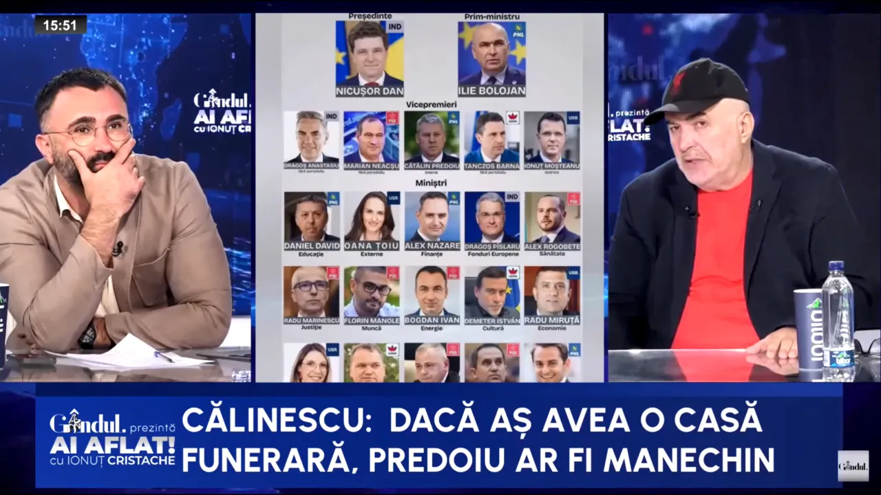În cadrul unei ediții transmise live de Gândul a emisiunii „Ai Aflat! cu Ionuț Cristache”, Florin Călinescu, actor, a vorbit despre noua structură a Guvernului. Urmăriți aici, integral, emisiunea lui Ionuț Cristache.