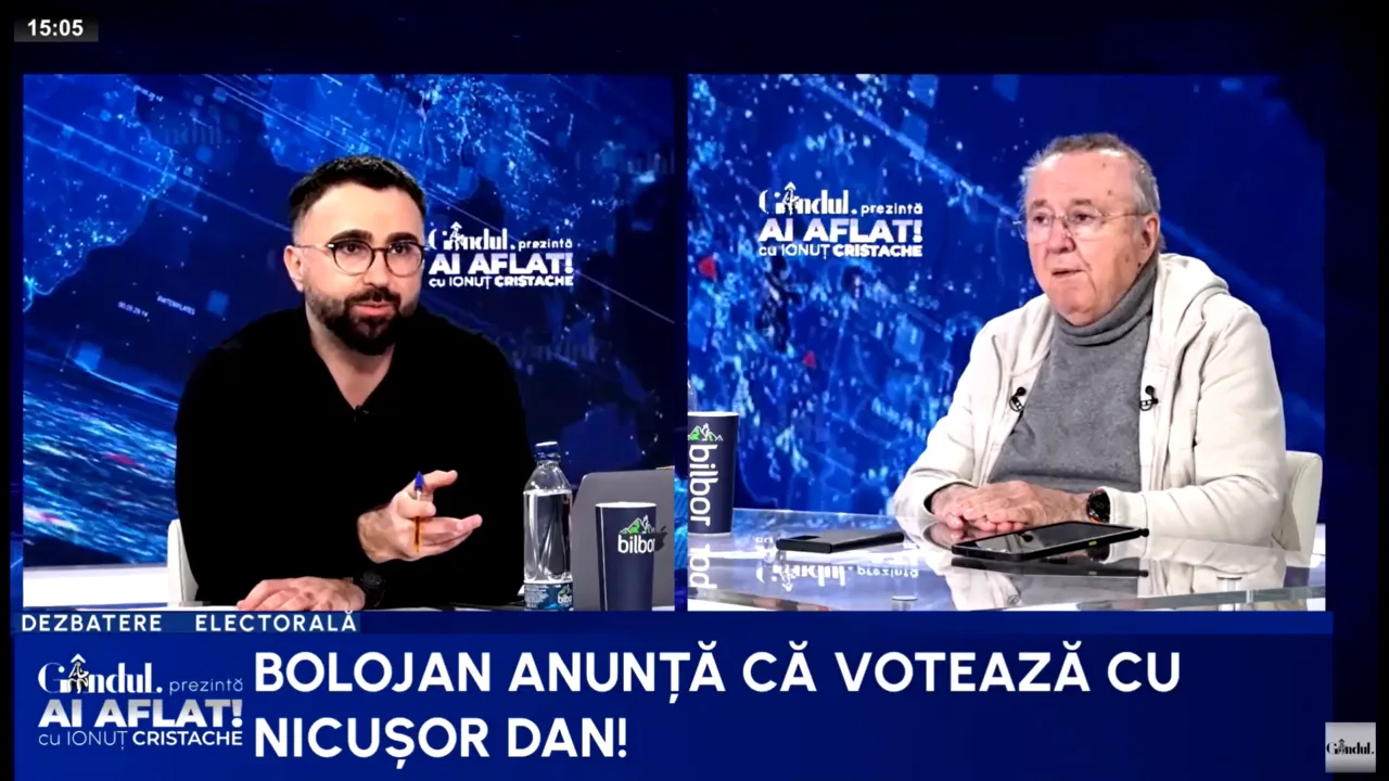 Într-o ediție transmisă live de Gândul a emisiunii „Ai aflat! Cu Ionuț Cristache”, scriitorul și publicistul Ion Cristoiu a prezentat un scenariu referitor la turul al doilea al alegerilor prezidențiale. Deși George Simion a obținut un scor de 40% în primul tur, comparativ cu 20% pentru Nicușor Dan, Cristoiu susține că rezultatul final este, de fapt, „oficializat” încă dinainte de vot. Urmărește aici, integral, emisiunea lui Ionuț Cristache.