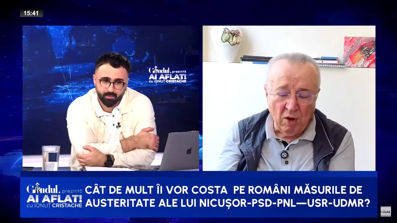 Într-o ediție transmisă live de Gândul a emisiunii Ai aflat! Cu Ionuț Cristache, scriitorul și publicistul Ion Cristoiu a discutat criza bugetară a României și presiunile venite din partea Uniunii Europene. El a scos în evidență atât nevoia unor măsuri urgente, cât și lipsa unei direcții clare în acțiunile actualului guvern. Urmărește aici, integral, emisiunea lui Ionuț Cristache.
