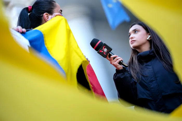 Mai multe persoane protesteaza impotriva Consiliului National al Audiovizualului (CNA), dupa ce aceasta institutie a retras licenta de emisie a postului Realitatea Plus, in Bucuresti, miercuri, 8 aprilie 2026. ALEXANDRU NECHEZ / MEDIAFAX FOTO