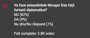 82% dintre respondenți au declarat că NU, au răspuns cu Da 9% dintre respondenți, în timp ce 7% au dat răspunsurile: Nu știu/Nu răspund. La acest chestionar, au răspuns, în total, 2.8K spectatori.