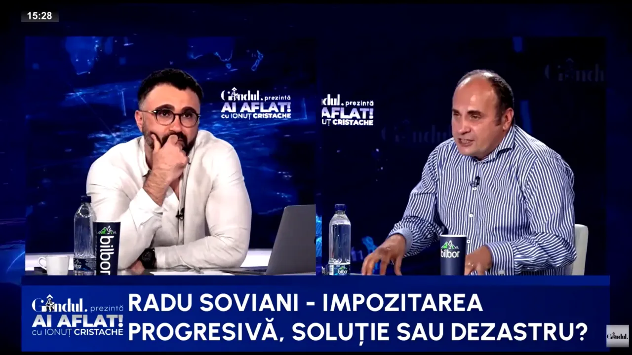 În cadrul unei ediții transmise live de Gândul a emisiunii „Ai aflat! cu Ionuț Cristache”, Radu Soviani a discutat despre propunerile privind reglarea deficitului bugetar al României, susținând că prin creșterea cotelor TVA nu se va face altceva decât să scadă puterea de cumpărare, lucru ce va duce la stagnarea economiei. Urmăriți aici, integral, emisiunea lui Ionuț Cristache.