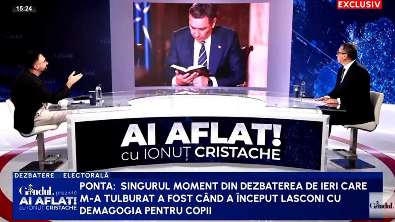 În cadrul unei ediții transmise live de Gândul a emisiunii „Ai aflat! cu Ionuț Cristache”, Victor Ponta a clarificat un episod intens discutat în spațiul public, legat de prezența unei biblii la o dezbatere la care a participat și Daniel Funeriu. Urmăriți aici, integral, emisiunea lui Ionuț Cristache.