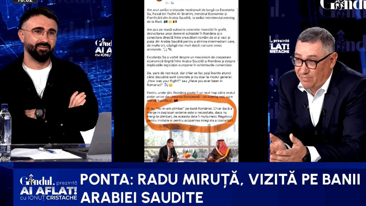 Prezent în studioul Gândul, în cadrul emisiunii Ai Aflat! cu Ionuț Cristache, fostul premier Victor Ponta a criticat pe un ton ironic vizita ministrului Economiei, Radu Miruță, în Arabia Saudită. Ministrul Economiei a anunţat că a fost promovată o Hotărâre de Guvern prin care o companie de stat a primit licența de exploatare a grafictului.
