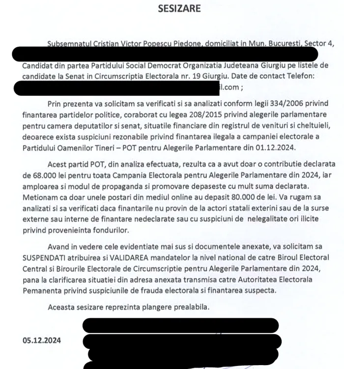 Biroul Electoral Central a respins, vineri, ca inadmisibilă, solicitarea formulată de Cristian Victor Popescu Piedone de verificare a surselor de finanţare ale campaniei electorale desfăşurate de către Partidul Oamenilor Tineri la alegerile parlamentare şi, în consecinţă, suspendarea atribuirii şi validării mandatelor la nivel naţional până la clarificarea situaţiei privind suspiciunile de fraudă electorală şi finanţare suspectă.
