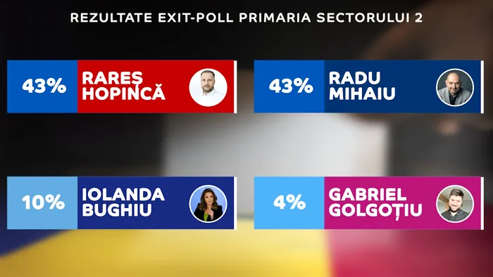 La Sectorul 2, Rareș Hopincă (PSD), candidatul Alianței PSD PNL, și Radu Mihaiu (USR), candidatul Alianței Dreapta Unită, au și ei același procent din voturile pentru Primăria Sectorului 2, respectiv 43%, conform datelor sondajului.