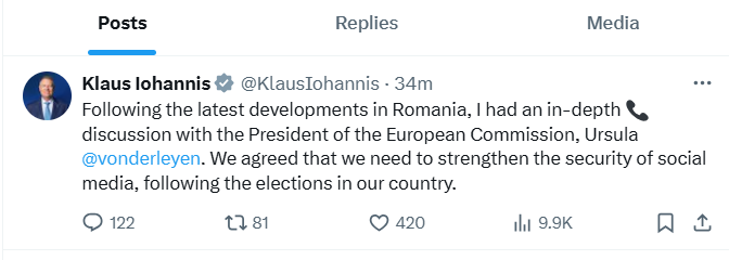 ”În urma ultimelor evoluţii din România, am avut o discuţie telefonică aprofundată cu Preşedintele Comisiei Europene, Ursula von der Leyen. Am fost de acord că trebuie să consolidăm securitatea social media, ca urmare a alegerilor din ţara noastră”, este mesajul postat pe platforma X de preşedintele Klaus Iohannis.