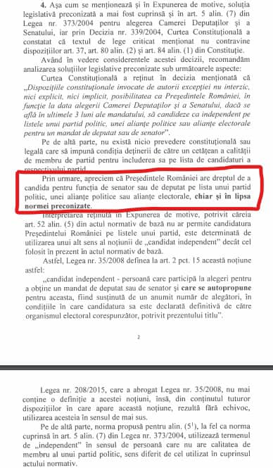 Potrivit documentului, ”Deși, teoretic, norma propusă pentru completare nu poate fi considerată ca având caracter individual, totuși frecvența extrem de scăzută de aplicare a normei, precum și momentul adoptării, ar putea determina concluzia că această lege a fost adoptată intuitu personae, cu consecința încălcării dispozițiilor art. 1 alin. (3) din Constituție, referitoare la statul de drept. Astfel, deși norma propusă este aplicabilă și pe viitor, dată fiind diferența dintre dimensiunea mandatului Președintelui României și mandatul senatorilor și deputaților, următorul moment în care norma ar fi aplicabilă va fi cu ocazia alegerilor parlamentare din anul 2044, întrucât abia atunci Președintele României se va putea afla în ipoteza normei, respectiv în situația în care alegerile parlamentare se organizează în ultimele 3 luni ale mandatului acestuia.”, mai precizează documentul.