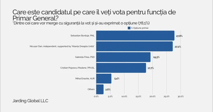 La întrebarea „Care este candidatul pe care îl veți vota pentru funcția de primar general”, 27,8% dintre respondenți îl indică pe Sebastian Burduja.