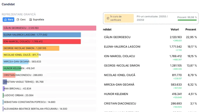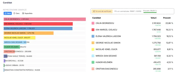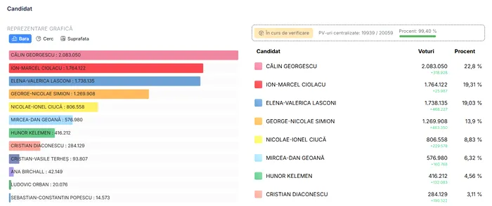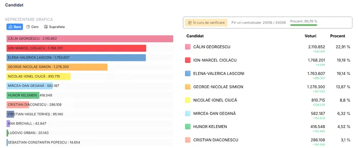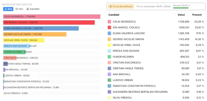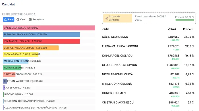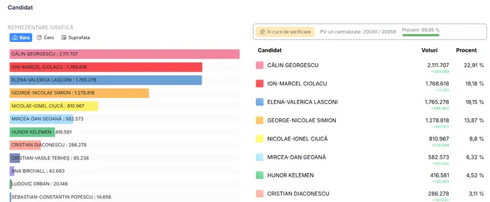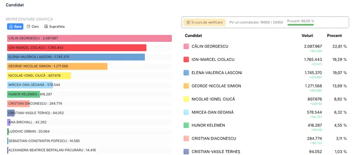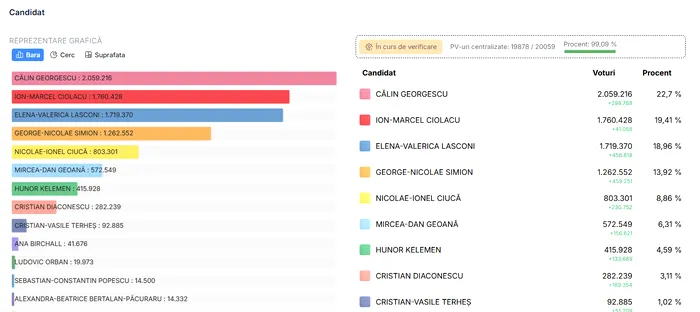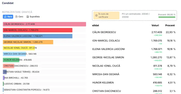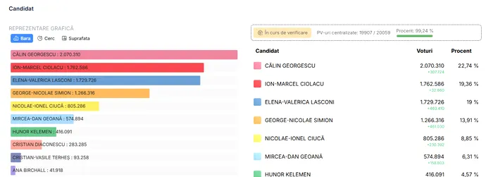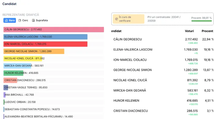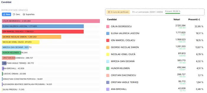 Călin Georgescu este în continuare pe primul loc, cu 22,17% din voturi. Marcel Ciolacu rămâne la 20,31%, cu 1,702,137 voturi.