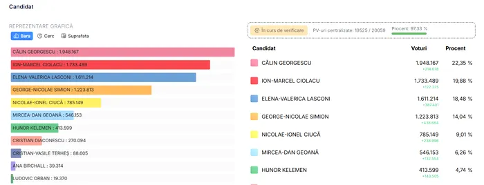 Călin Georgescu conduce clasamentul cu 22,95%, acumulând peste 2,1 milioane de voturi.