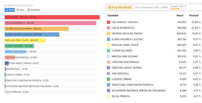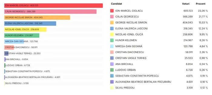Diferența dintre Marcel Ciolacu (1.760.428), locul al doilea, și Elena Lasconi (1.719.370), locul al treilea, este de 41.058 voturi.