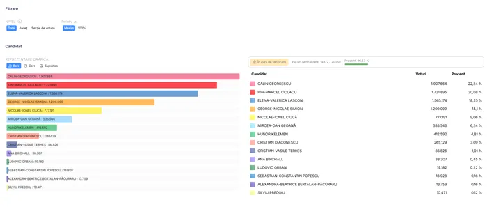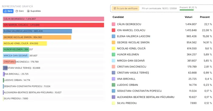 Marcel Ciolacu (1,721,895 voturi) și Călin Georgescu (1,907,664 voturi) au în continuare aceleași procente.