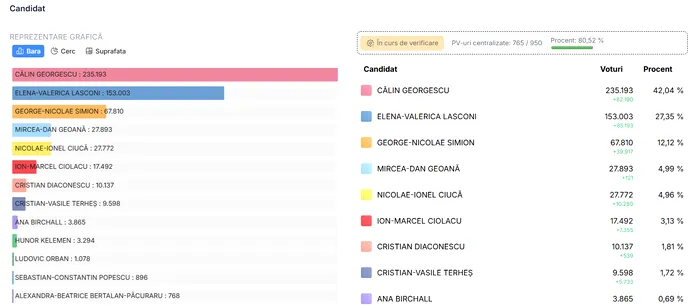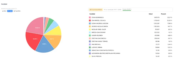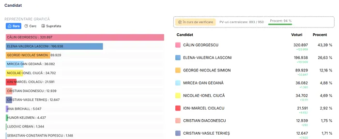 Călin Georgescu își consolidează poziția pe locul 1, cu circa 40.000 de voturi peste Marcel Ciolacu. Elena Lasconi urcă un procent și atinge 16,17% dintre voturi.