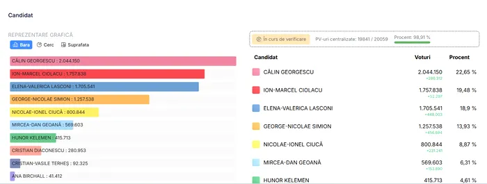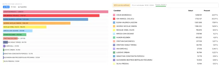 UPDATE ora 17:00: S-a încheiat numărătoarea voturilor din toate secțiile din țară și din străinătate. Conform datelor publicate de AEP, Călin Georgescu a obținut 2.120.404 voturi (22,94%), iar Elena Lasconi a fost votată de 1.772.503 alegători (19,18%).