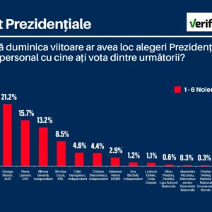 Cel mai recent sondaj realizat de Verifield la comanda USR, în perioada 1-6 noiembrie, prin metoda CATI (telefonic), pe 1.064 de respondenți, arată ca Elena Lasconi este candidatul de dreapta cu șanse clare de a intra în turul 2.