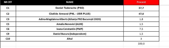 Astfel, la Sectorul 1, conform unui exit poll realizat de CURS-Avangarde și prezentat duminică seara, după închiderea urnelor, candidata USR-PLUS, Clotilde Armand, ar fi obținut 47% dintre voturi, față de Daniel Tudorache (PSD), care ar fi obținut 37% din sufragii.