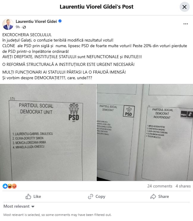 „Escrocheria secolului! În județul Galați, o confuzie teribilă modifică rezultatul votului! Clone ale PSD prin siglă și nume lipsesc PSD de foarte multe voturi! Peste 20% din voturile pierdute de PSD printr-o înșelătorie ordinară! Aveți dreptate, instituțiile statului sunt nefuncționale și inutile! O reformă structurală a instrituțiilor este urgent necesară! Mulți funcționari ai statului părtași la o fraudă imensă! Și vorbim despre democrație? Care, unde?”, este mesajul notat de bărbat, pe Facebook.