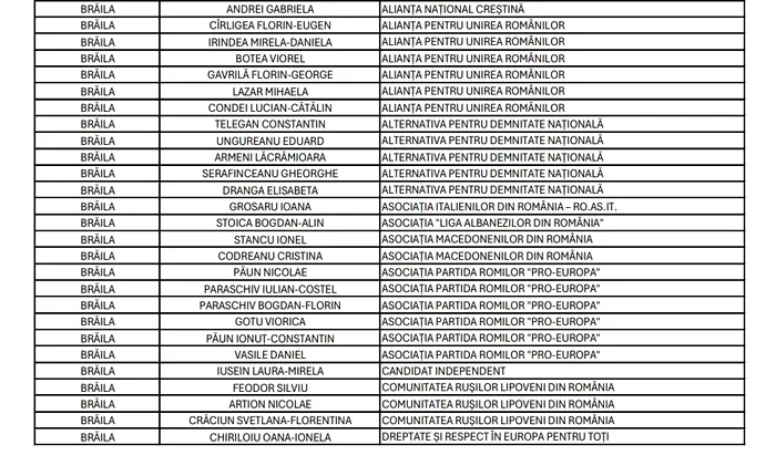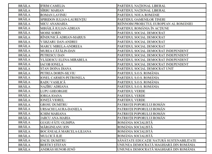 Iată cum arată listele oficiale pentru județul Brăila, pentru Senat și Camera Deputaților.