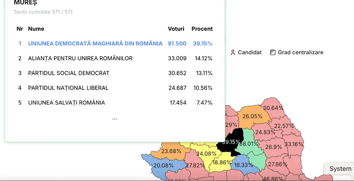 ROAEP transmite rezultatele finale ale alegerilor parlamentare: UDMR domină categoric în județul Mureș cu 39,15%. AUR se clasează pe locul 2 cu un scor de 14,12%, iar PSD ia doar 13,11% din electorat.