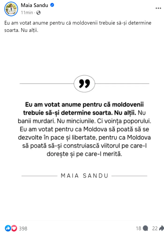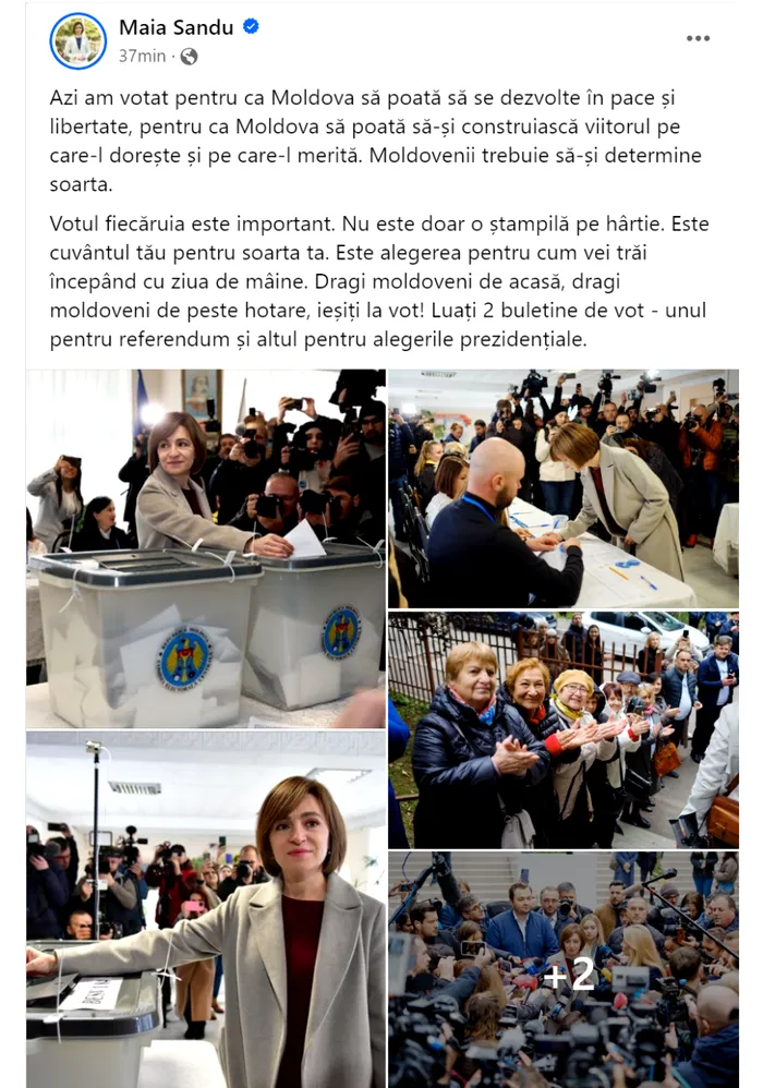 „Azi am votat pentru ca Moldova să poată să se dezvolte în pace și libertate, pentru ca Moldova să poată să-și construiască viitorul pe care-l dorește și pe care-l merită. Moldovenii trebuie să-și determine soarta. Votul fiecăruia este important. Nu este doar o ștampilă pe hârtie. Este cuvântul tău pentru soarta ta. Este alegerea pentru cum vei trăi începând cu ziua de mâine. Dragi moldoveni de acasă, dragi moldoveni de peste hotare, ieșiți la vot! Luați 2 buletine de vot – unul pentru referendum și altul pentru alegerile prezidențiale. Eu am votat anume pentru că moldovenii trebuie să-și determine soarta. Nu alții”.
