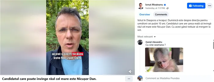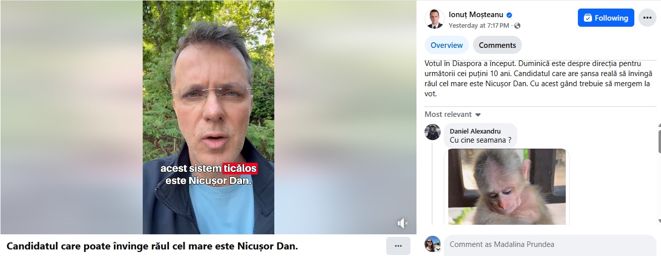 BEC a admis sâmbătă o plângerea înregistrată privind materialul încărcat pe platforma online Facebook de Ionuţ Moşteanu, cu titlul „Candidatul care poate învinge răul cel mare este Nicușor Dan, și a dispuns eliminarea, de către Meta Platforms Ireland Limited din Irlanda, furnizorul serviciului de platformă, a acestul „conținut ilegal”, potrivit deciziei publicate pe site-ul BEC