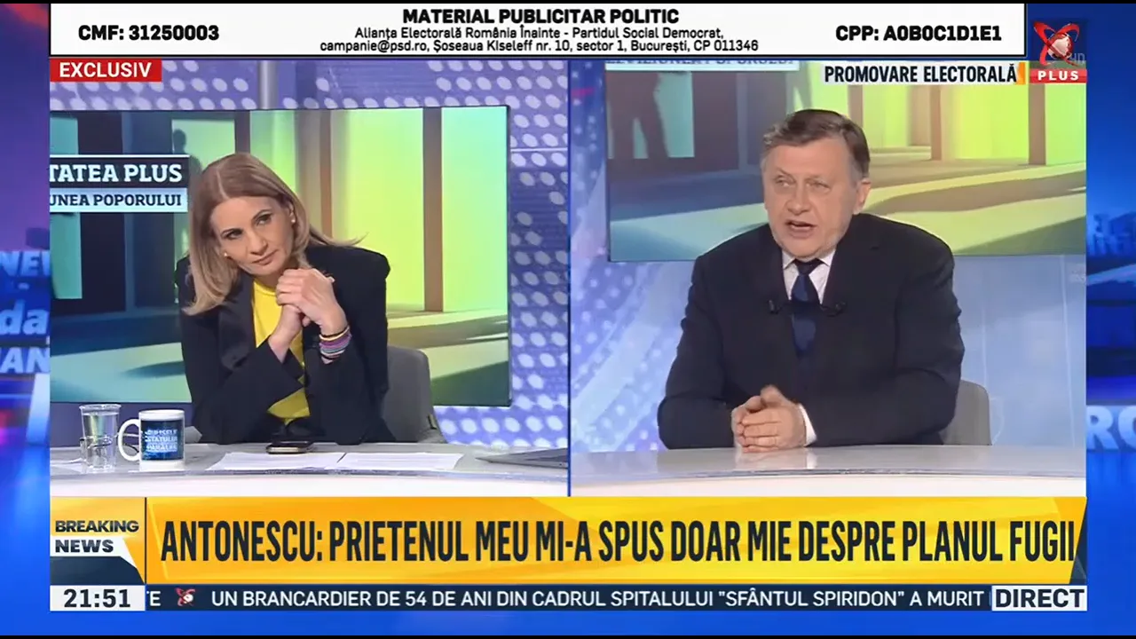 „Frumoasă aporie construiește Liviu Pleșoianu. Eu cred că atâta vreme cât în spatele alegerii viitorului președinte va sta un vot democratic, exprimat,  al românilor, acel președinte n-are dreptul să plece de acolo pe acest motiv de natură retroactivă. Așa poate mă apuc și desecretizez mai multe lucruri și poate constat că erata Curții Constituționale din 2012, la referendum, ține minte domnul Plășoianu, sunt convins, a fost, nu știu, dubios adoptată. Și atunci ne întoarcem în 2012 și mă fac eu președinte, și mai sunt 10 ani până să vină domnul Georgescu. Nu se poate juca așa istoria și politica. Dar dacă lucruri incorecte și ilegale s-au petrecut, îl asigur pe domnul Pleșoianu că vor ieși la iveală.”, a adăugat Antonescu.