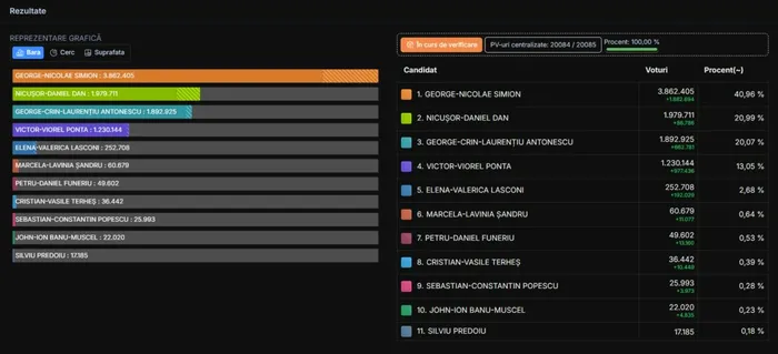 - Locul 1. George Simion, cu 40,96% – 3.862.405 voturi;
