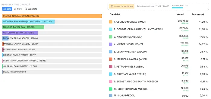 Procesele verbale din cele aproape 20.000 de secții din țară și străinătate sunt centralizate de Autoritatea Electorală Permanentă după închiderea urnelor, la ora 21:00, ora României, pe tot mapamondul.George Simion, candidatul AUR, a obținut 2.107.630 de voturi (41,29%), la primul tur de scrutin al alegerilor prezidențiale, după centralizarea a 69,32% din procesele verbale, arată datele publicate duminică seara, în timp real, pe site-ul Autorității Electorale Permanente.