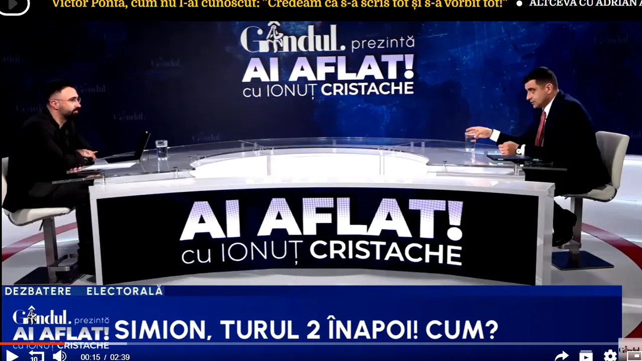 Candidatul George Simion reafirmă că nu ar fi candidat niciodată dacă nu i-ar fi cerut acest lucru Călin Georgescu. Pe de altă parte, liderul AUR reclamă hărțuirea de către media a politicienilor, în special de jurnaliștii acreditați în Parlament. Pur și simplu, aleșii sunt alergați la propriu prin Casa Poporului, acuză Simion la Ai Aflat cu Ionuț Cristache, la Gândul Exclusiv.