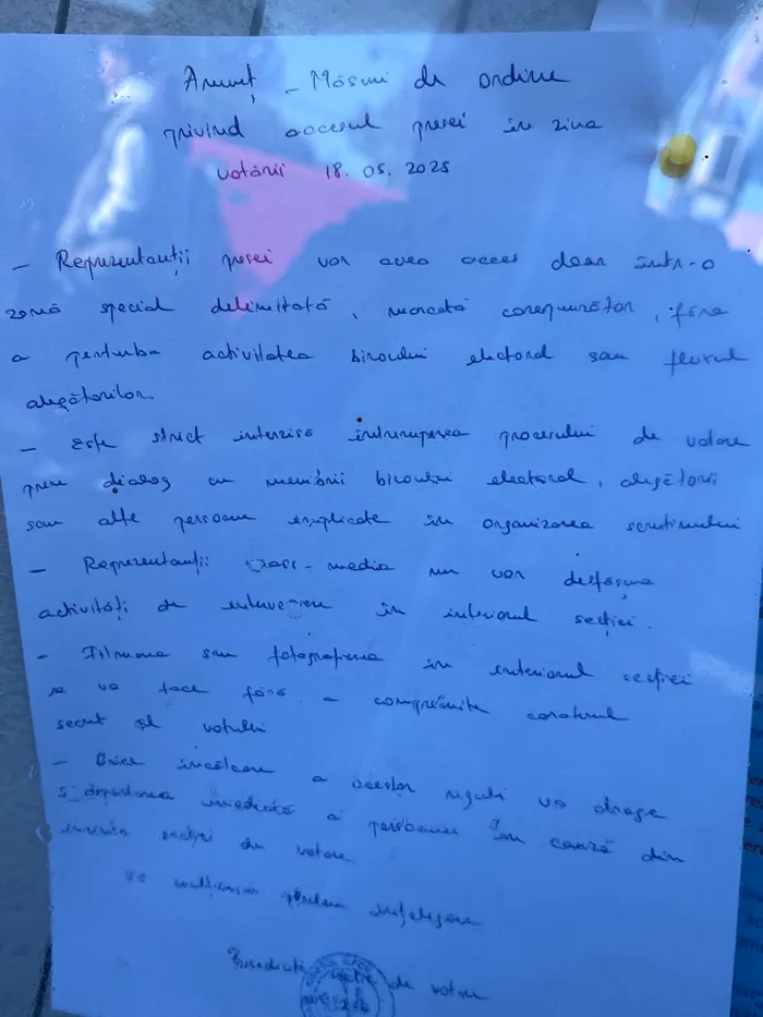 Reprezentanții mass-media nu vor desfășura activități de intervievare în interiorul secției… Orice încălcare a acestor reguli va atrage îndepărtarea imediată a persoanelor în cauză din incinta secției de votare