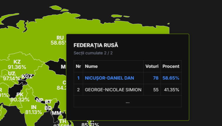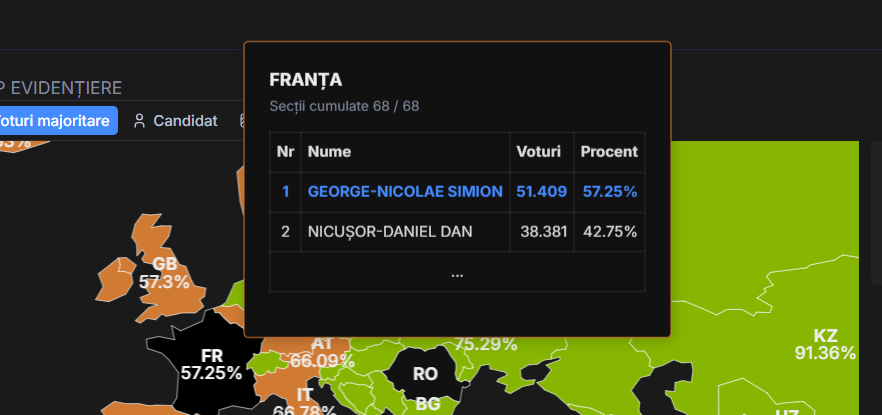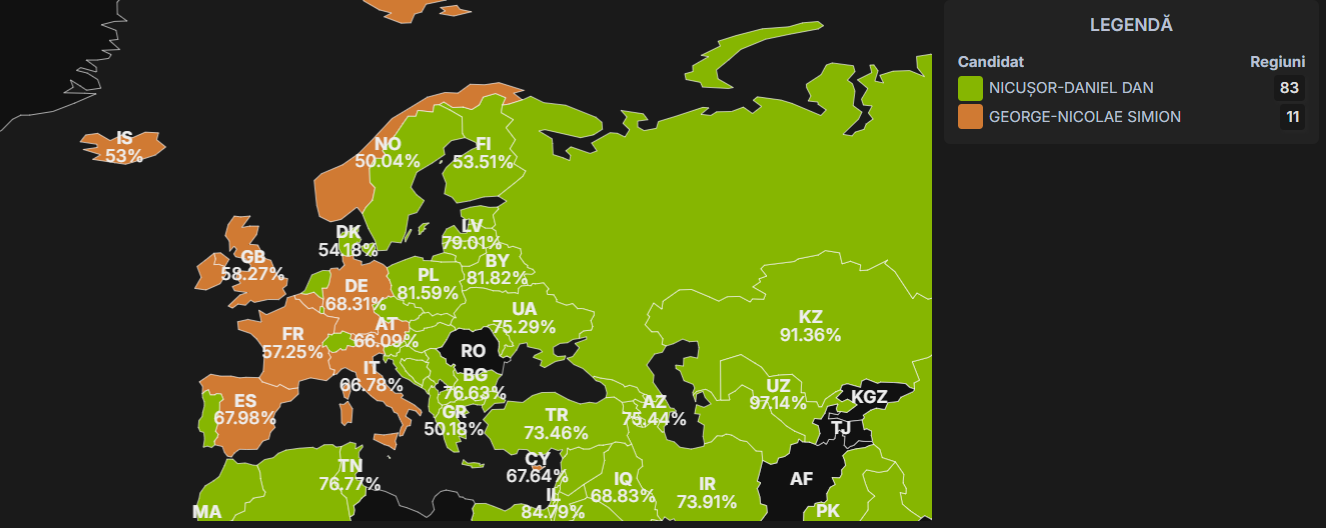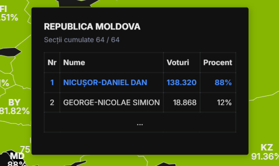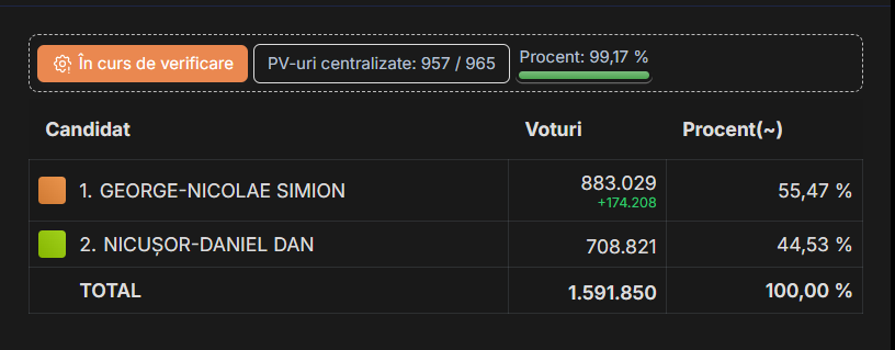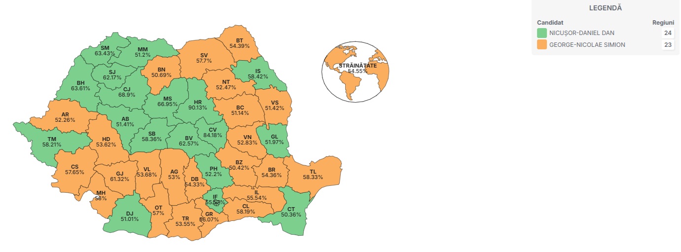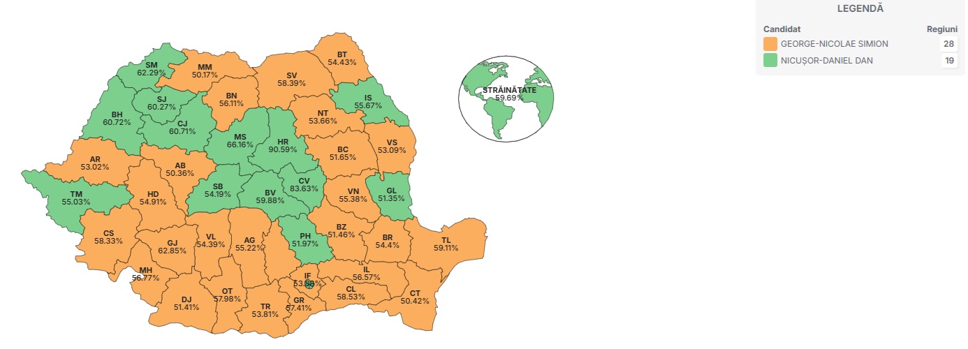 - George-Nicolae Simion a obţinut 5.339.053 voturi valabil exprimate, reprezentând 46,40% din totalul voturilor valabil exprimate.