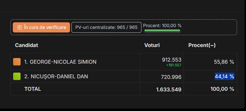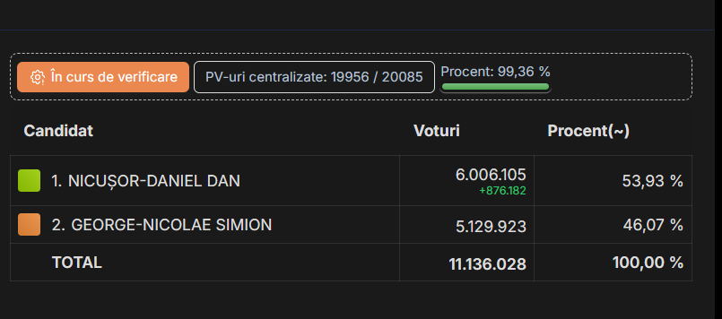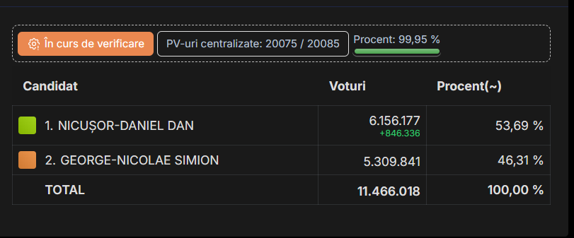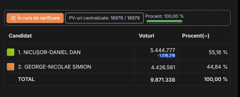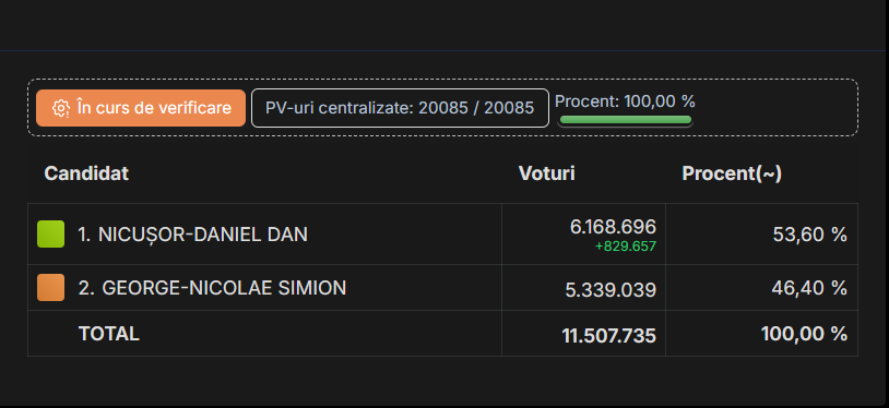 - Nicuşor-Daniel Dan a obţinut 6.168.642 voturi valabil exprimate, reprezentând 53,60% din totalul voturilor valabil exprimate;